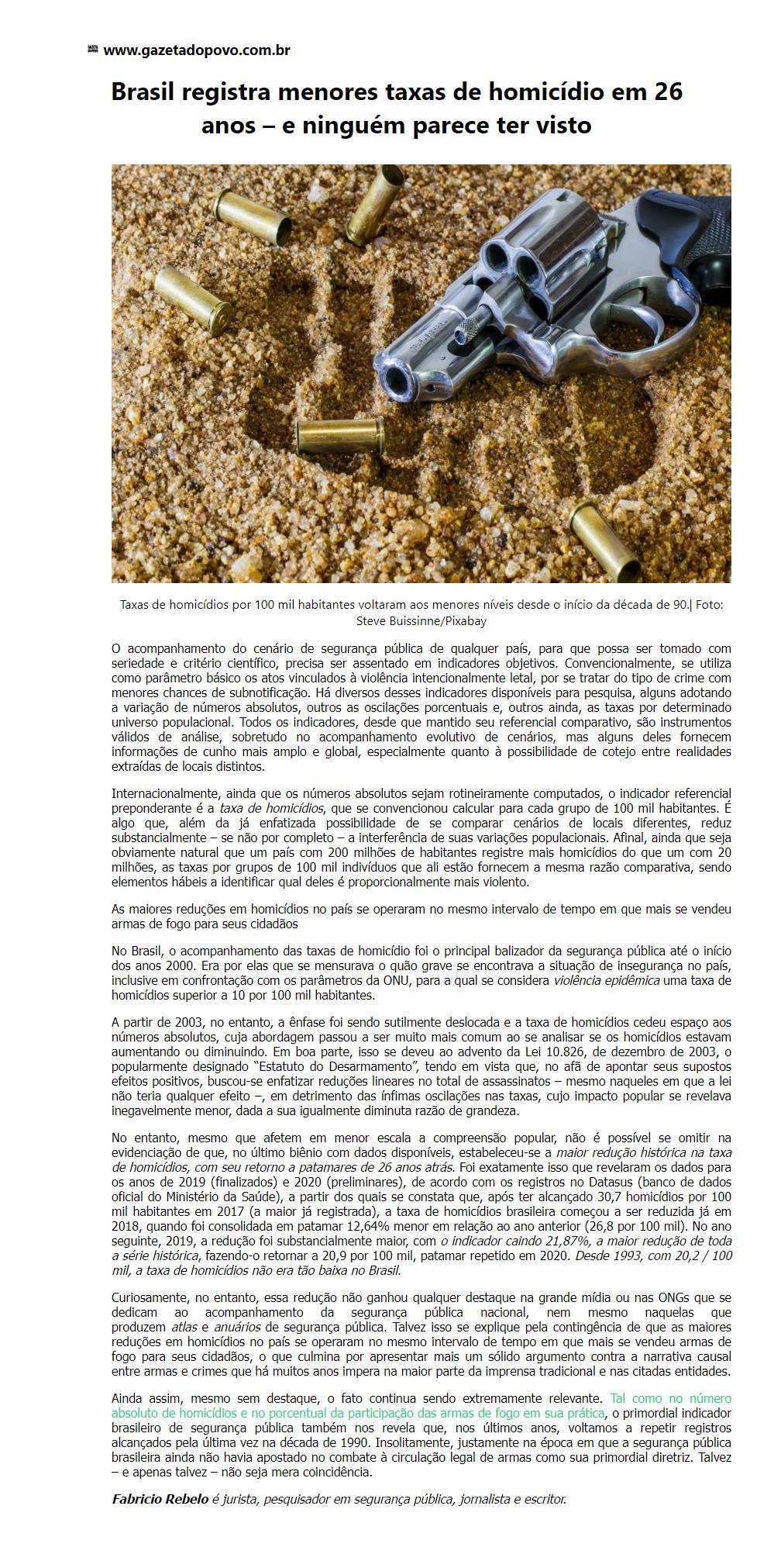 Taxas de homicídios por 100 mil habitantes voltaram aos menores níveis desde o início da década de 90.