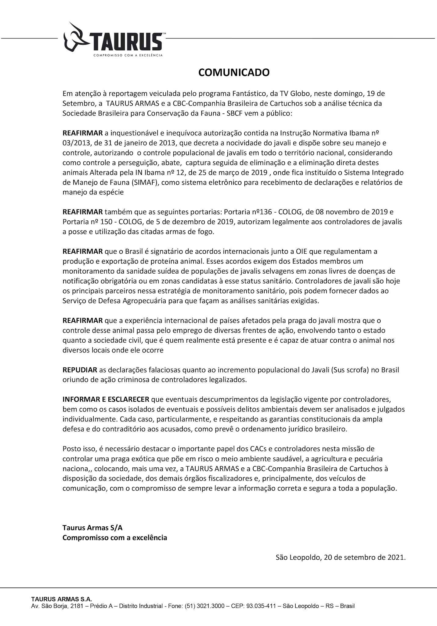 No mesmo sentido, as empresas Taurus Armas e CBC publicaram um Comunicado sobre o assunto.