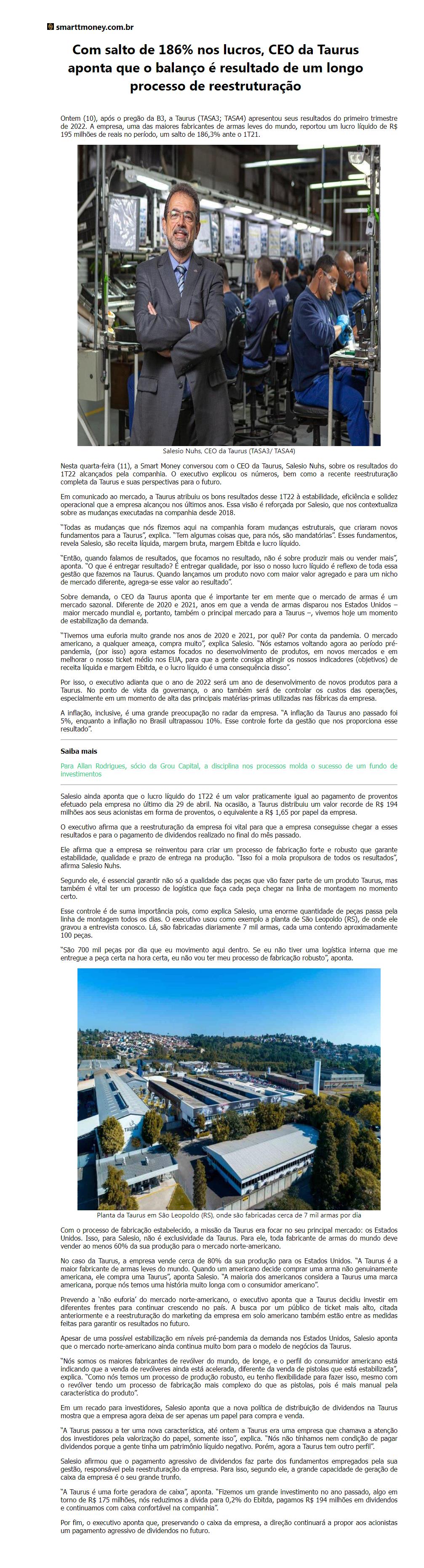 Ontem (10), após o pregão da B3, a Taurus (TASA3; TASA4) apresentou seus resultados do primeiro trimestre de 2022. A empresa, uma das maiores fabricantes de armas leves do mundo, reportou um lucro líquido de R$ 195 milhões de reais no período, um salto de 186,3% ante o 1T21.