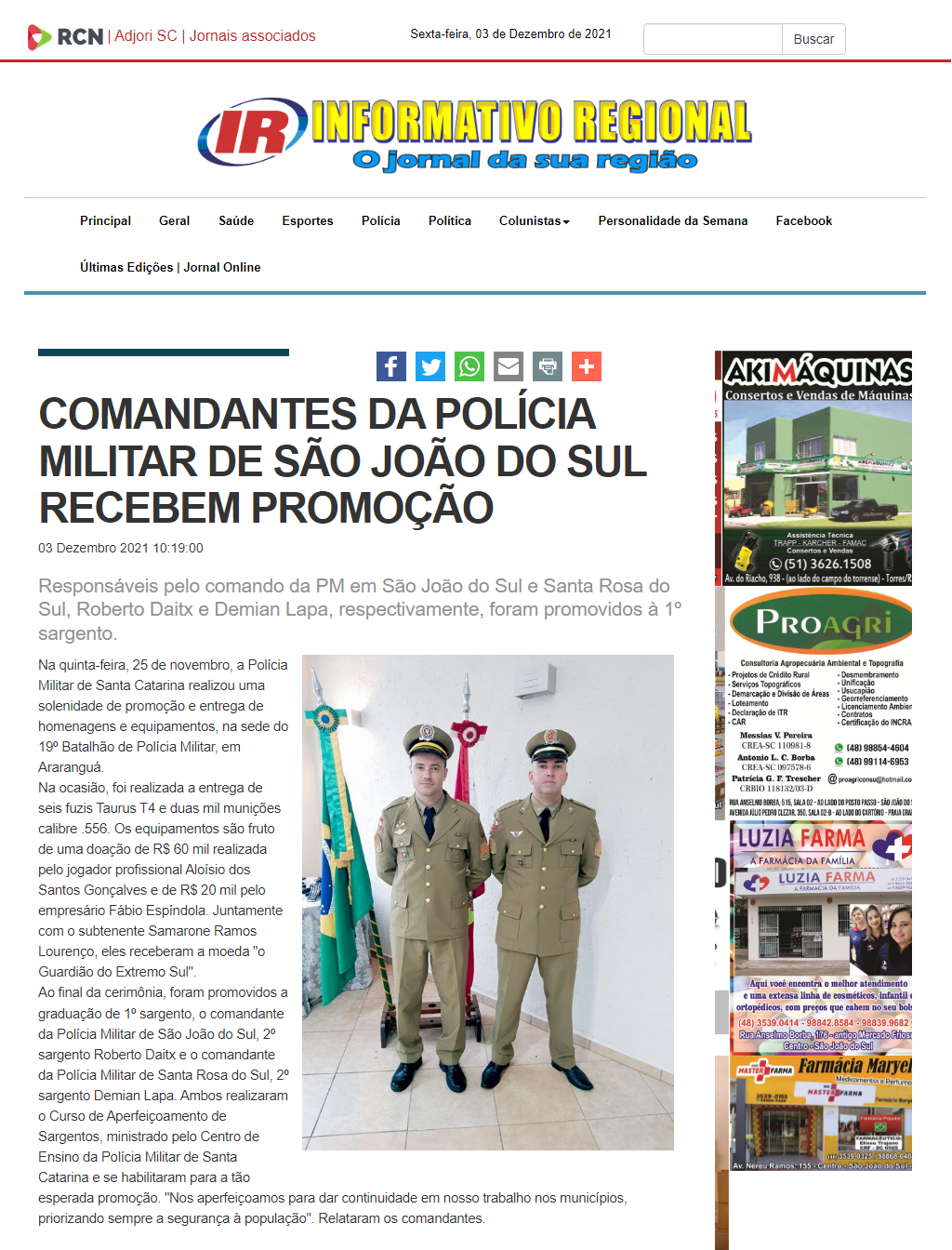 Na quinta-feira, 25 de novembro, a Polícia Militar de Santa Catarina realizou uma solenidade de promoção e entrega de homenagens e equipamentos, na sede do 19º Batalhão de Polícia Militar, em Araranguá.