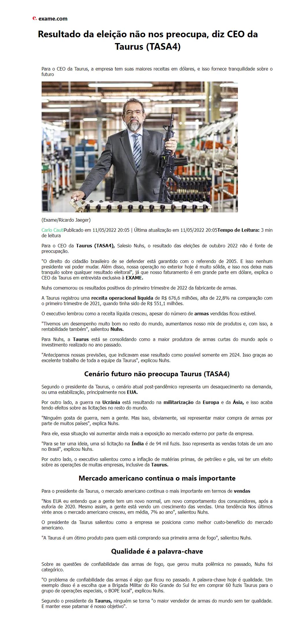 Fonte: https://exame.com/invest/mercados/resultado-eleicoes-preocupa-taurus-tasa4/