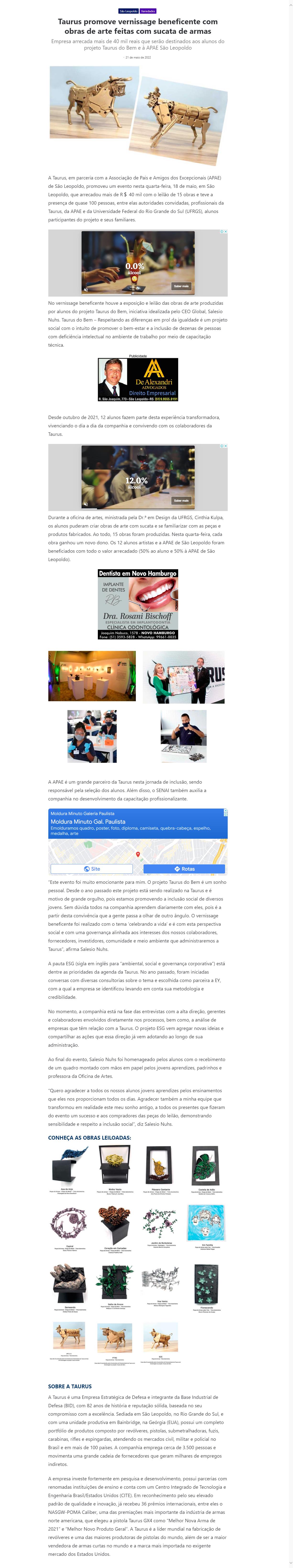A Taurus, em parceria com a Associação de Pais e Amigos dos Excepcionais (APAE) de São Leopoldo, promoveu um evento nesta quarta-feira, 18 de maio, em São Leopoldo, que arrecadou mais de R$ 40 mil com o leilão de 15 obras e teve a presença de quase 100 pessoas, entre elas autoridades convidadas, profissionais da Taurus, da APAE e da Universidade Federal do Rio Grande do Sul (UFRGS), alunos participantes do projeto e seus familiares.