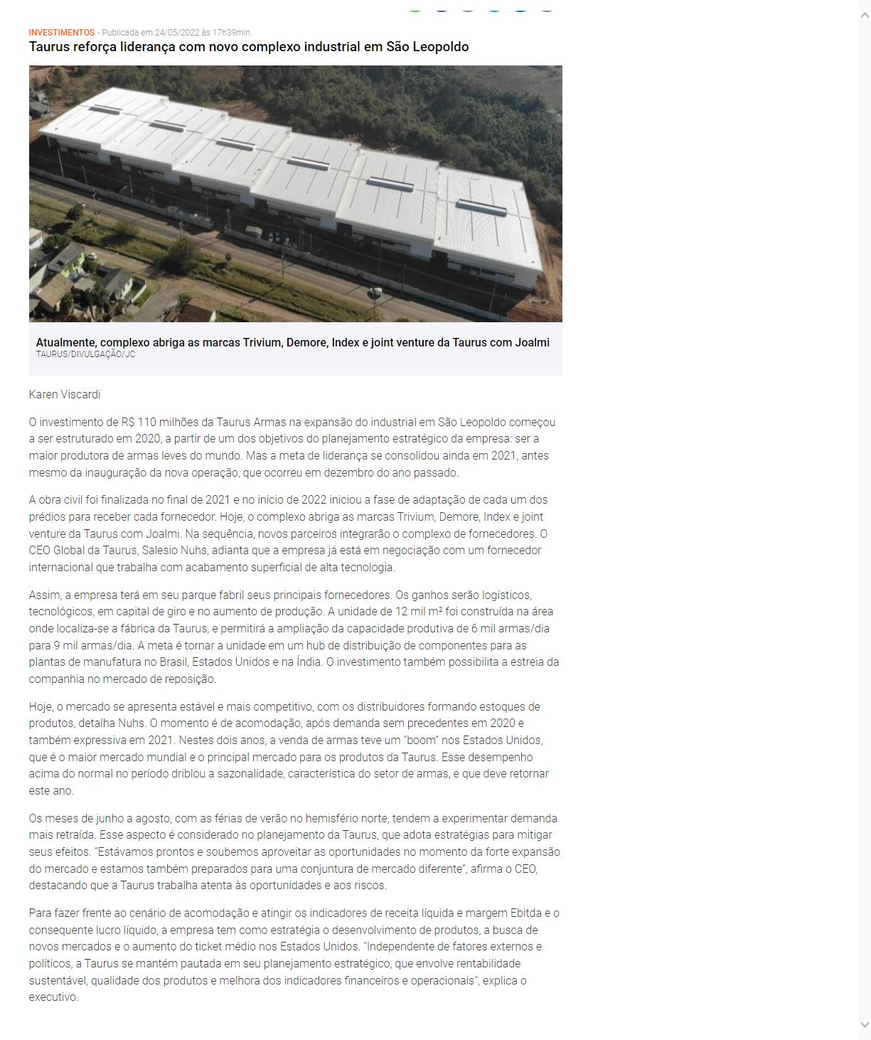 O investimento de R$ 110 milhões da Taurus Armas na expansão do industrial em São Leopoldo começou a ser estruturado em 2020, a partir de um dos objetivos do planejamento estratégico da empresa: ser a maior produtora de armas leves do mundo. Mas a meta de liderança se consolidou ainda em 2021, antes mesmo da inauguração da nova operação, que ocorreu em dezembro do ano passado.